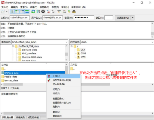 登陆成功后,“本地站点”选择需要上传数据的本地数据路径,“远程站点” 中,双击 GSA 文件夹,进入 GSA 目录