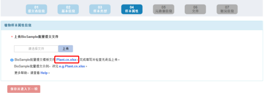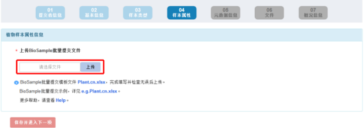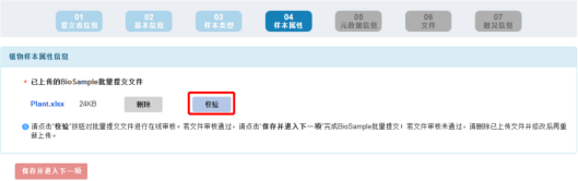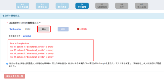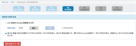 4) 若文件审核不通过,请点击“删除”键,删除已上传的文件并按系统提示信息修改后,再重新上传批量表格文件,直至审核通过:当文件审核通过,请点击“保存并进入下一项”键,完成 BioSample 批量提交。