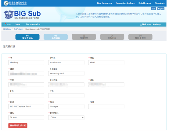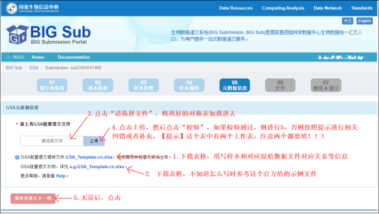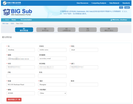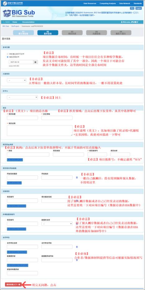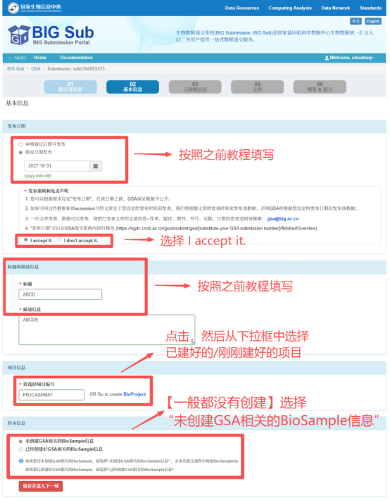 05. 提交后会自动回到GSA数据集页面,填写本次提交数据基本信息,对应前面的“GSA基本信息填写”步骤
