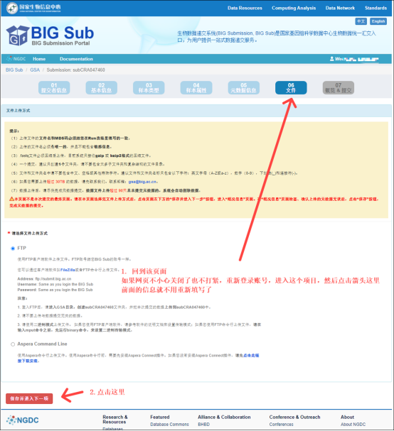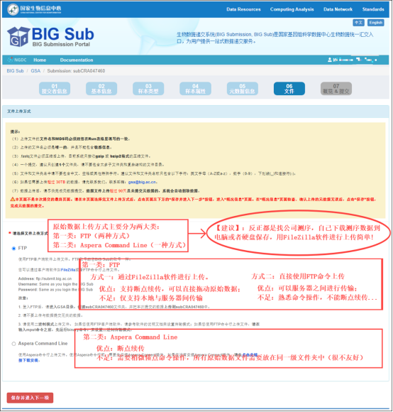 08. 上传原始数据了,数据文件上传方式选择为 FTP 客户端(推荐使用)和Aspera 命令行上传;