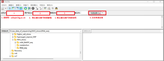 打开软件,界面如下图所示,填写主机信息为“submit.big.ac.cn” ,用户名和密码填写 GSA 数据库的登陆帐号邮箱和密码,然后点击“快速连接” ,状态栏显示登陆成功,如果提示错误,请根据提示信息查看错误原因;