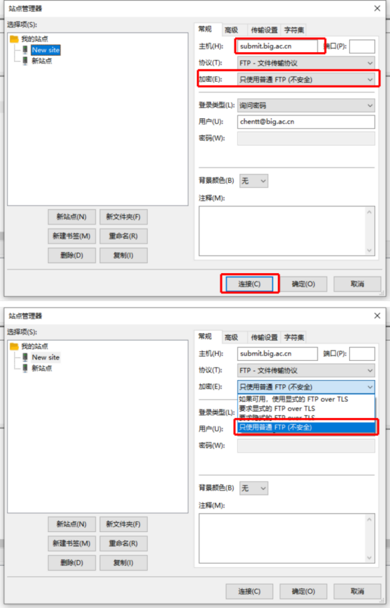 解决方案:如下图所示点击菜单栏“文件” 中的“站点管理器” ,修改“加密”选项为“只使用普通 FTP”或者“” ,同时,填写正确的主机地址:submit.big.a.cn ,帐号和密码信息。最后点击“连接” 即可。