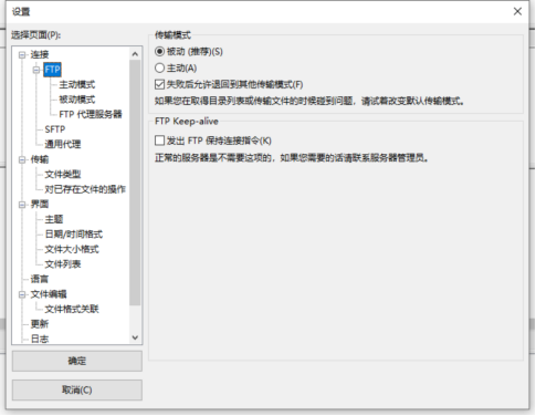解决方案:Filezila –>编辑->设置中修改传输模式,改为被动模式