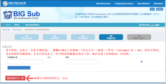 04. 点击上一步中的“BioProject”链接创建BioProject;若有已建好的,填入项目编号,并往下从“填写本次提交数据基本信息”开始参考