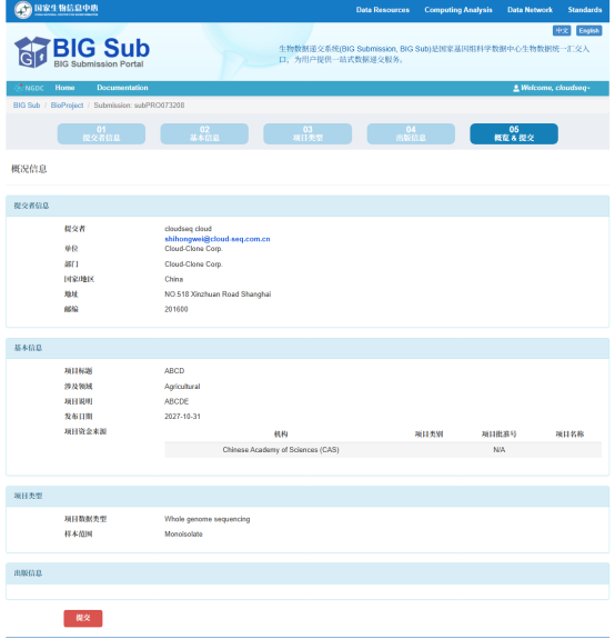 进入“概览&提交”页面后,对 GSA 数据及其相关信息进行整体预览:在正式提交之前,用户可通过点击进度条上的按钮,进入相应页面修改信息。请务必检查无误后再点击“提交(Submit)”完成递交。
