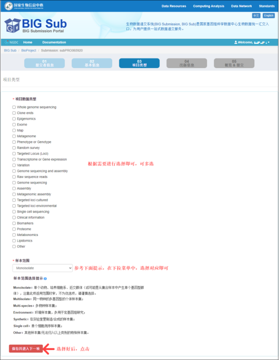 选择BioProject项目数据类型