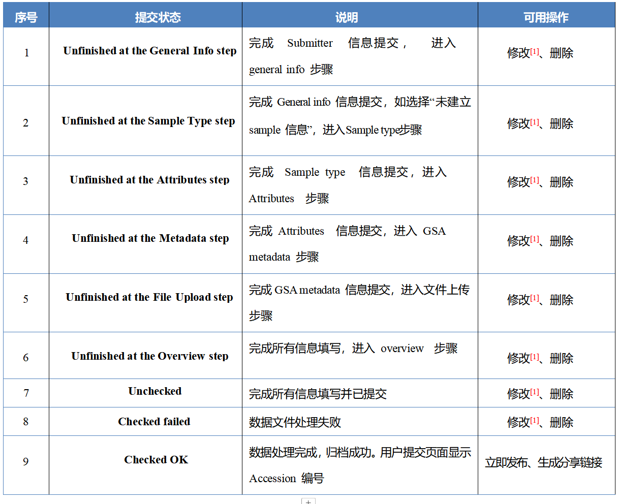 Tips:系统中 GSA 的提交状态共有 10 种,具体情况详见下表: