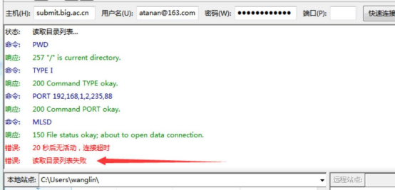 问题 2:FTP 登陆时,状态栏出现 MLSD 的报错,显示“读取目录列表失败”。